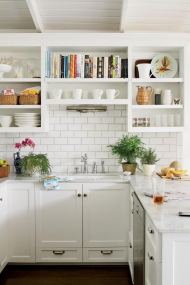Kabin atau penyimpanan terbuka dapat di gunakan untuk meletakan berbagai macam peralatan makanan yang berbentuk unik atau berwarna-warni. Apalagi jika kabin terbuka tersebut di padukan dengan warna putih yang cocok di padukan dengan warna dapur.